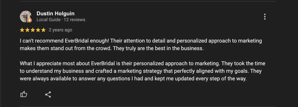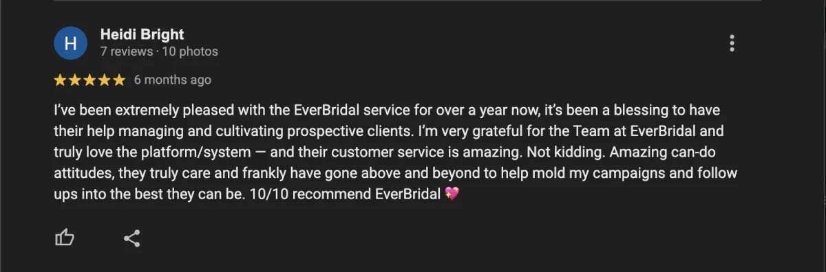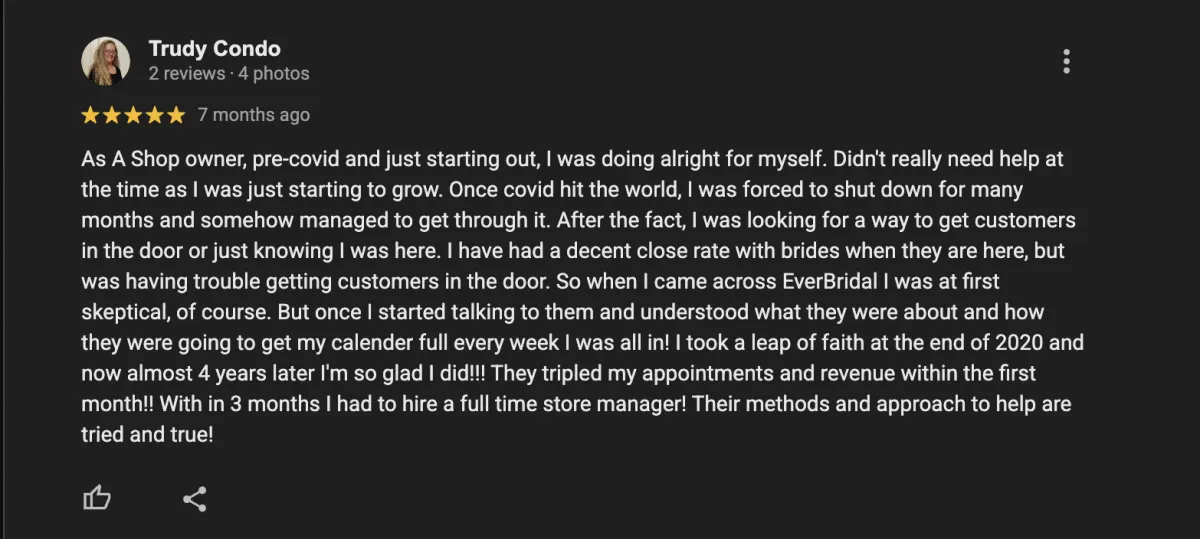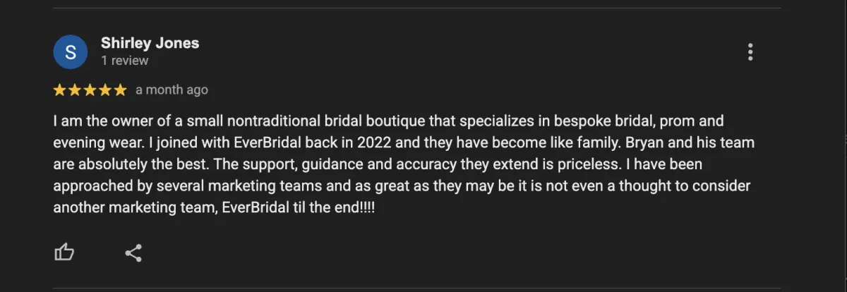 We’re excited to learn more about your bridal shop and explore how we can help you grow!